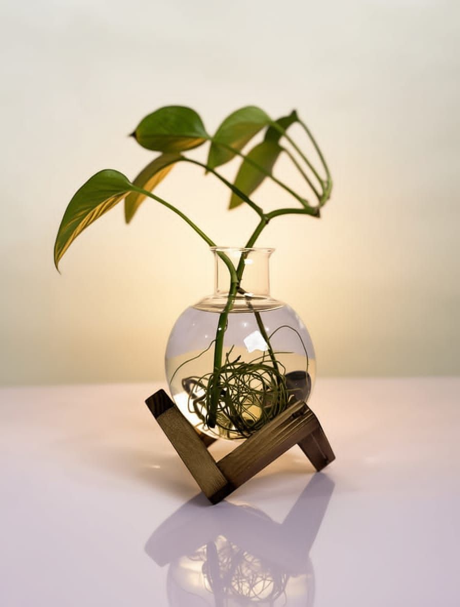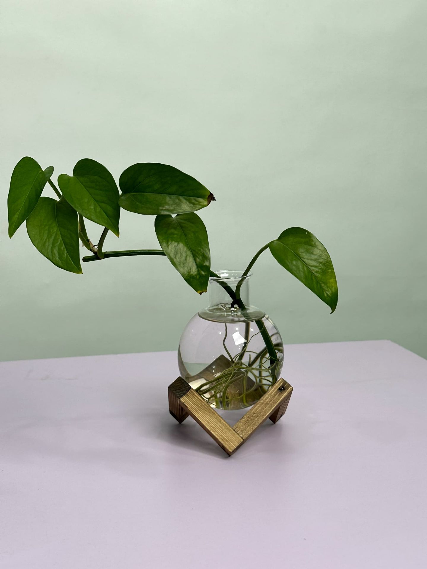 این گلدون شیشهای با پایه چوبی ، مخصوص قلمهگیری و تکثیر گیاهان آپارتمانی مثل پتوس، فیلودندرون، سینگونیوم و… طراحی شده و بهترین گزینه برای ریشهزنی توی آب محسوب میشه.